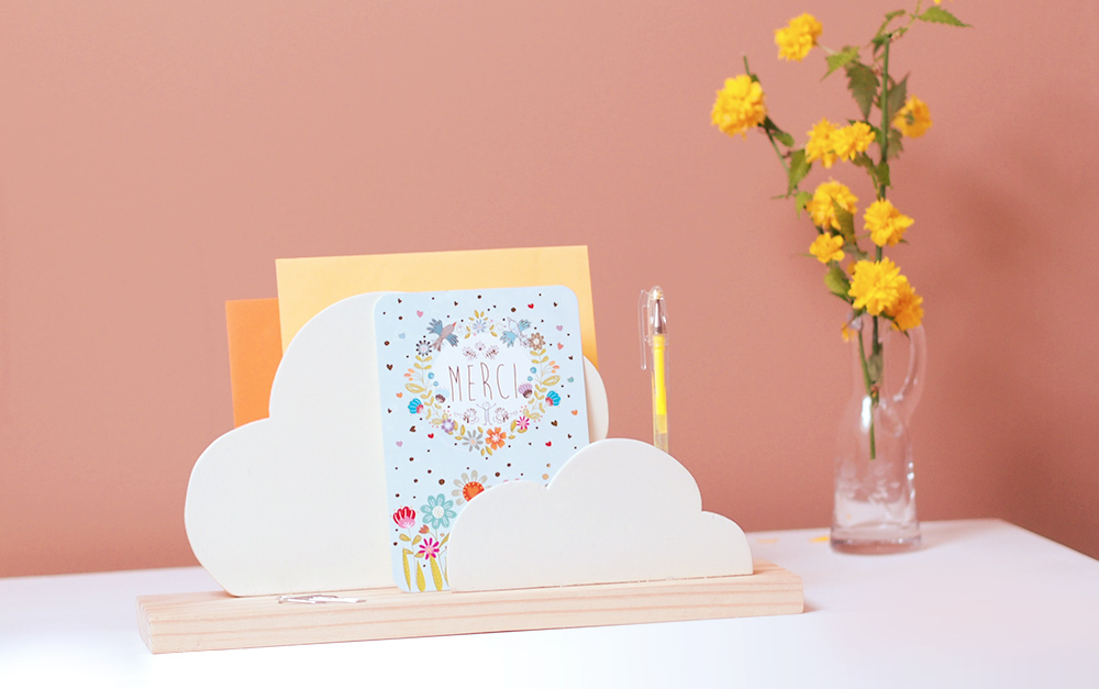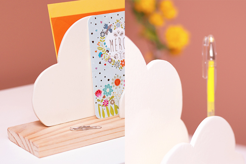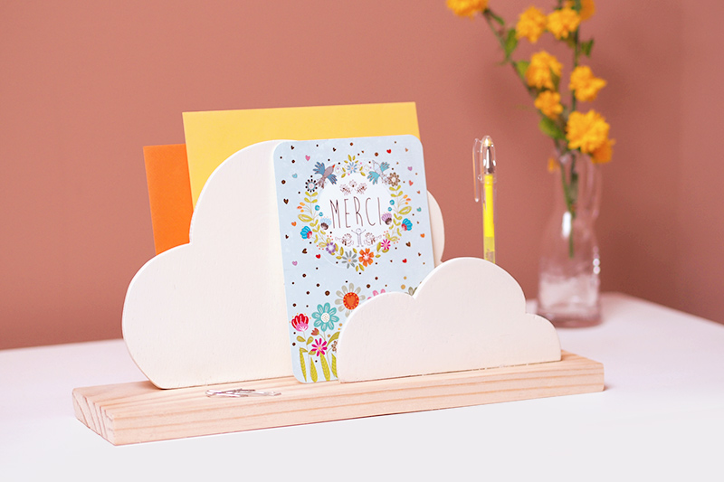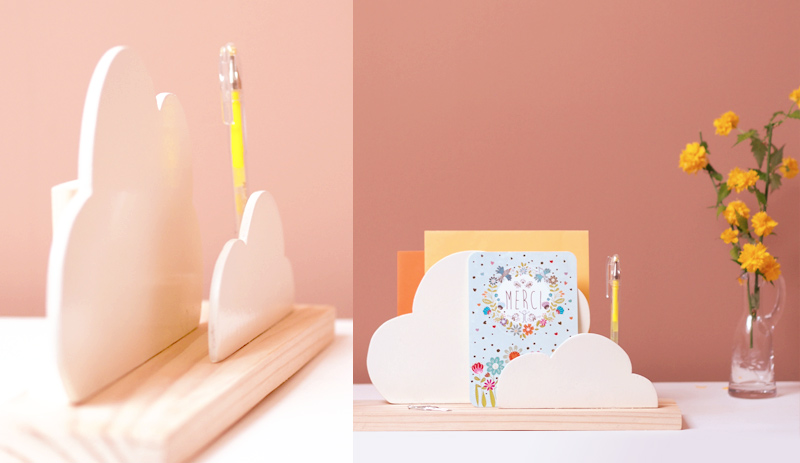 Je suis donc partie de l’idée de deux nuages juxtaposés pour former un plateau de table dans l’esprit d’un organisateur de bureau : idéal à disposer près de votre poste de travail ou alors dans une entrée pour avoir toujours à porter de vue les lettres à poster !