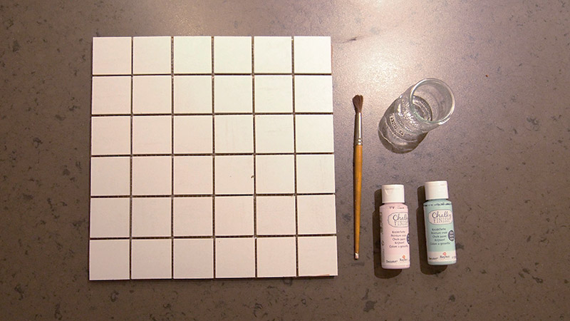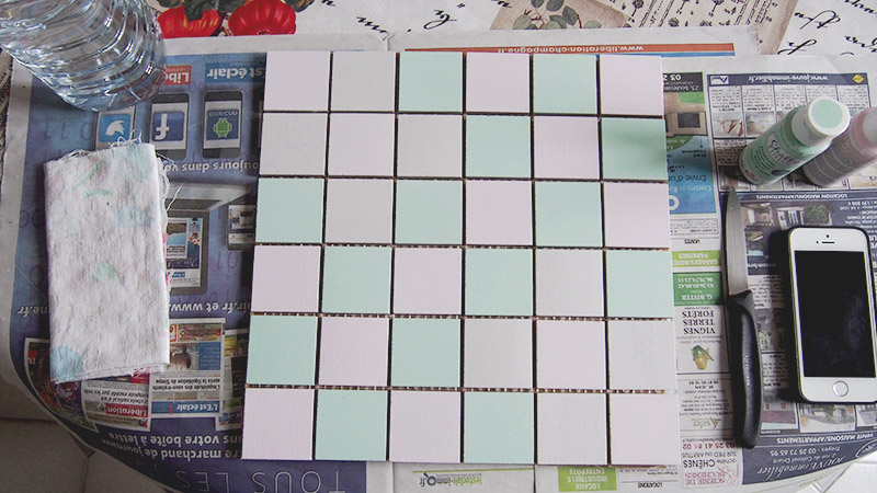 Préparer les mosaïques, les nettoyer et les peindre à votre convenance. J’ai de mon côté passé 3 couches pour que ce soit bien mat.