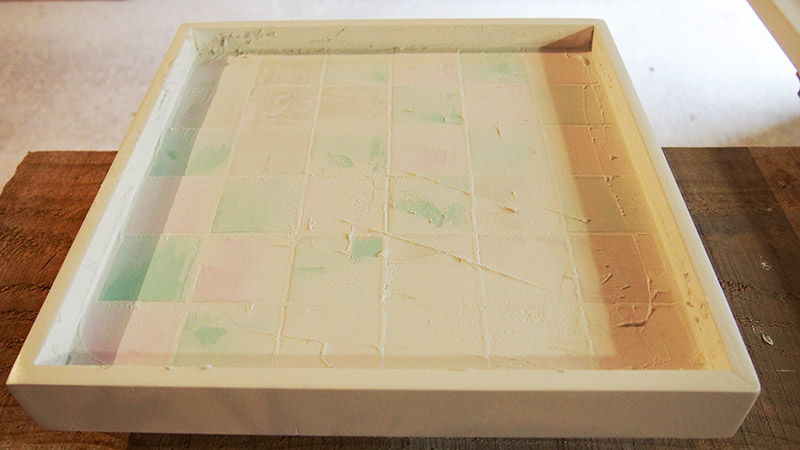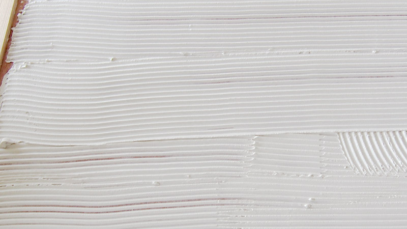 Étaler la colle de manière homogène à l’aide d’une raclette sur le support en bois puis déposer les moqaïques. Pendant que la colle prend, peindre les tasseaux de bois en blanc. Après une nuit de séchage, procéder au remplissage des joints.