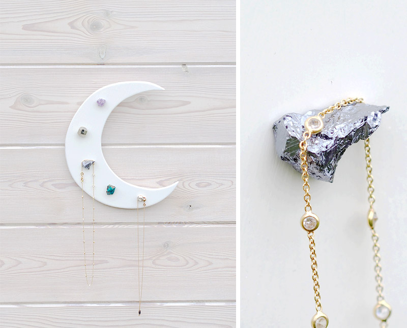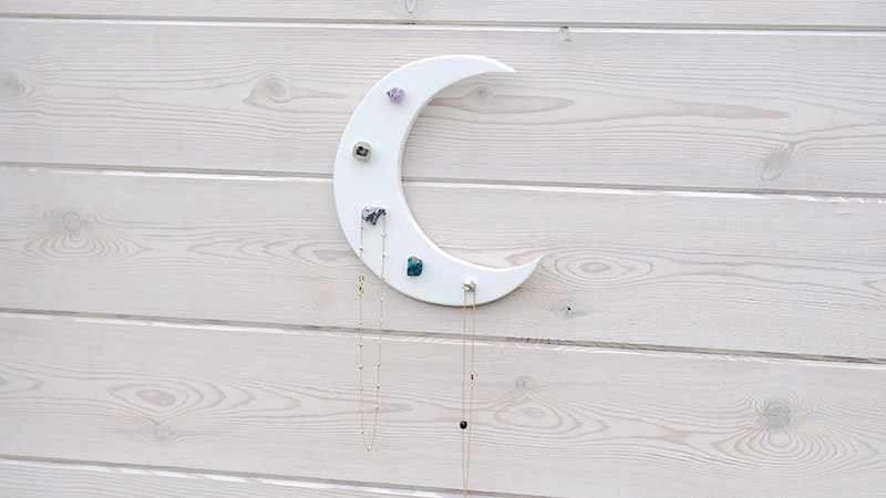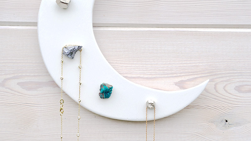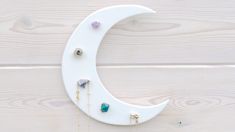 Création lunaire à reproduire avec vos enfants : un porte-bijoux en forme de lune orné de véritables pierres minérales.