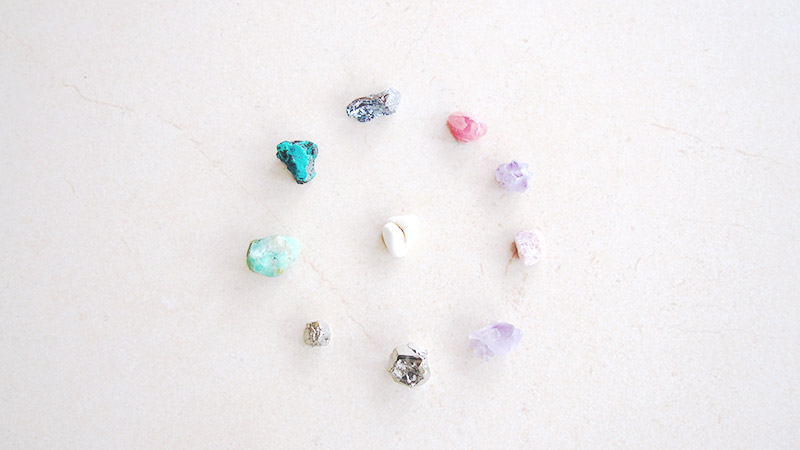 Les pierres ont des pouvoirs énergétiques qui agissent sur notre physique et notre mental (la lithothérapie). Je trouve ça tellement inspirant et intéressant que, pour cette création, l’idée de poser ses bijoux sur ces pierres m’a tout de suite séduite. Voici les pierres que j’ai choisi :