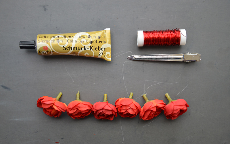 - Prenez les fausses fleurs. Entourez-les du fil de fer (si possible de la même couleur) au niveau des pointes et rassemblez-les.