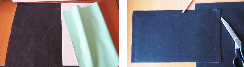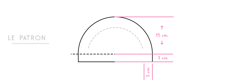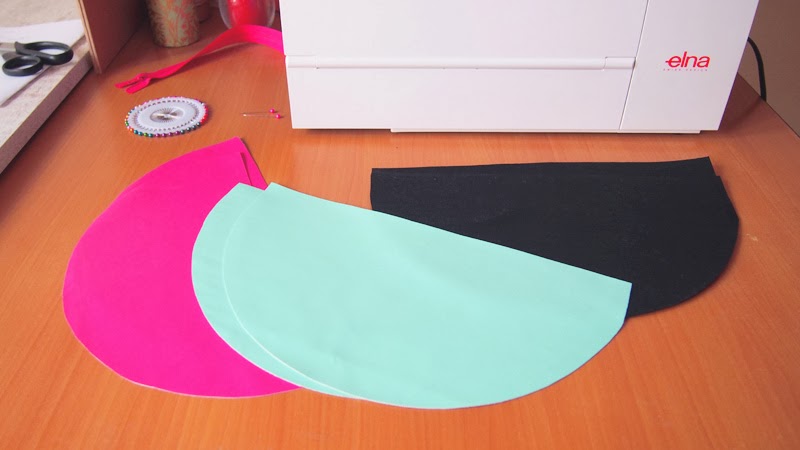 - Découpez les autres demis cercles dans chaque tissu afin de préparer vos bases (2 roses, 2 verts thermocollés, 2 noirs de la doublure). Toutes les dimensions sont identiques sauf les roses qui seront plus petites.