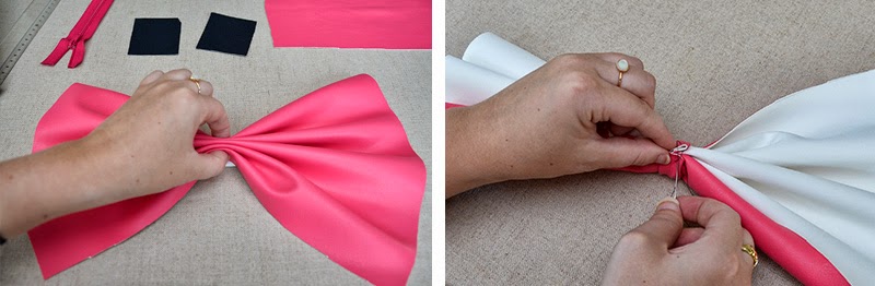 3) Réaliser le noeud avec le grand rectangle rose. Il suffit de pincer le centre, puis faire comme un accordéon. Fixer le centre avec le petit rectangle. Vous pouvez le coudre au dos pour être sur qu’il soit bien fixé.