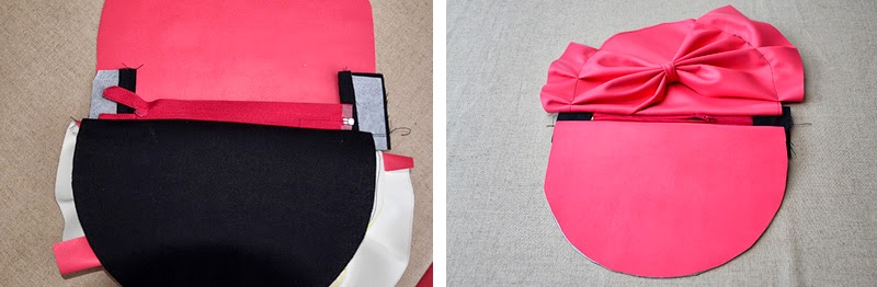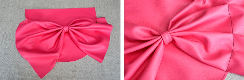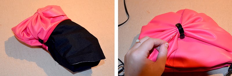 Après la pochette zébrée, je vous présente une de mes dernière réalisation maison : un sac rose en simili cuir avec un petit nœud sur le devant !
