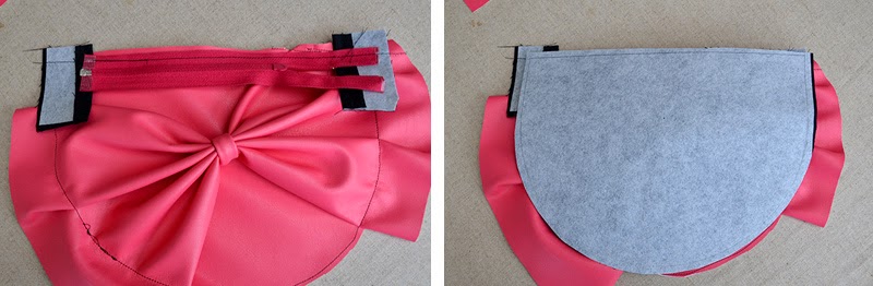 simili cuir : idem pour les 2 arcs de cercle + 1 rectangle plus petit 2x8cm. 28x 35 cm pour le noeud (grand rectangle).