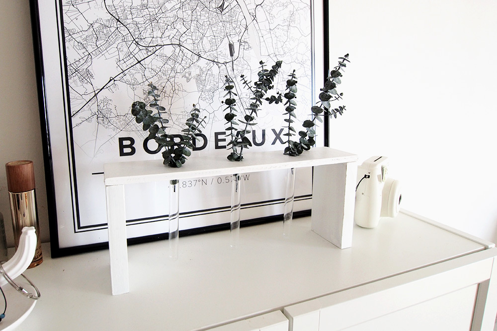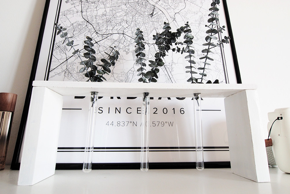 Je cherchais depuis quelques temps en boutique un vase minimal pour exposer des brins d’eucalyptus séchés. Je n’ai pas trouvé exactement ce que je voulais donc j’ai décidé de le créer directement. C’est vrai que depuis que j’ai déménagé, je n’ai pas encore d’atelier à proprement parlé et le temps me manque un peu pour créer mais ici rien de bien compliqué. Alors si vous êtes comme moi, il vous faudra juste un petit morceau de bois, de la peinture et des tubes à essai…