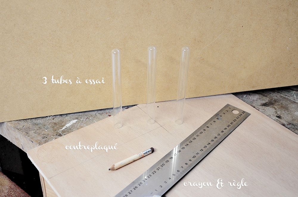 – 2 petits morceaux (côtés) : 8cm x 14cm - A l’aide d’une perceuse, faites 3 trous aux dimensions du tube à essai (le diamètre au millimètre près afin que le tube à essai soit assez serré et tienne tout seul).