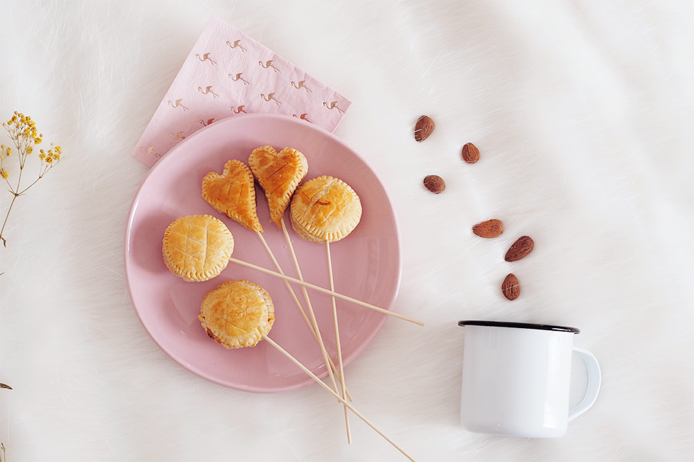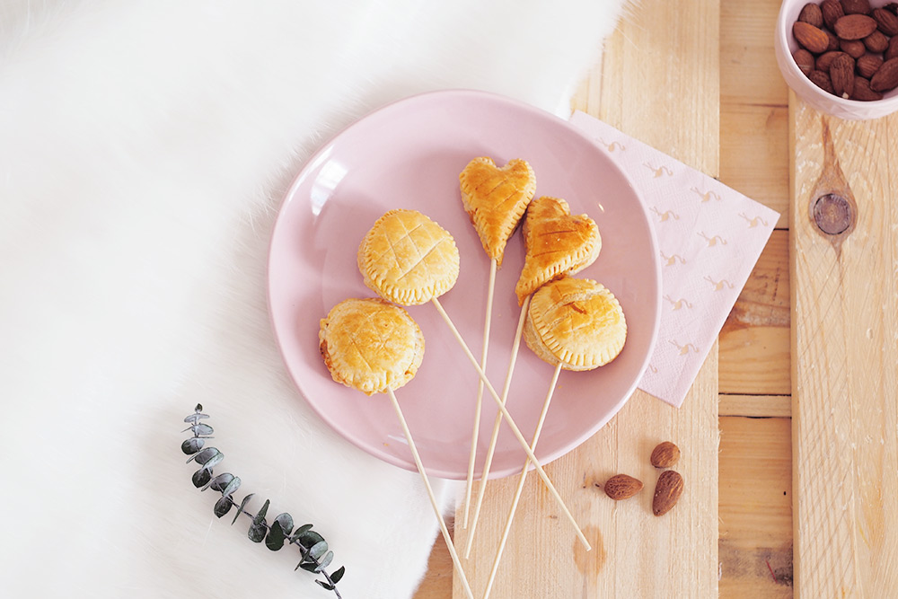 Pour l’occasion, j’ai concocté une version « normale » avec la galette et sa forme ronde telle qu’on la connait et j’ai aussi réalisé des petites « sucettes » de galette des rois, idéale pour amuser les petits ou avoir de simples bouchées à l’amande pour le goûter.