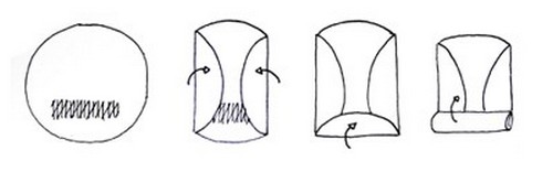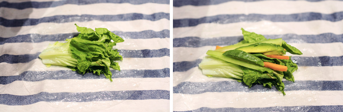 - Plier les rouleaux de printemps comme ci dessous (rabattre les bords de la feuille de riz sur la farce ainsi que le bord devant vous. Enrouler le rouleau en faisant attention de bien le serrer.)