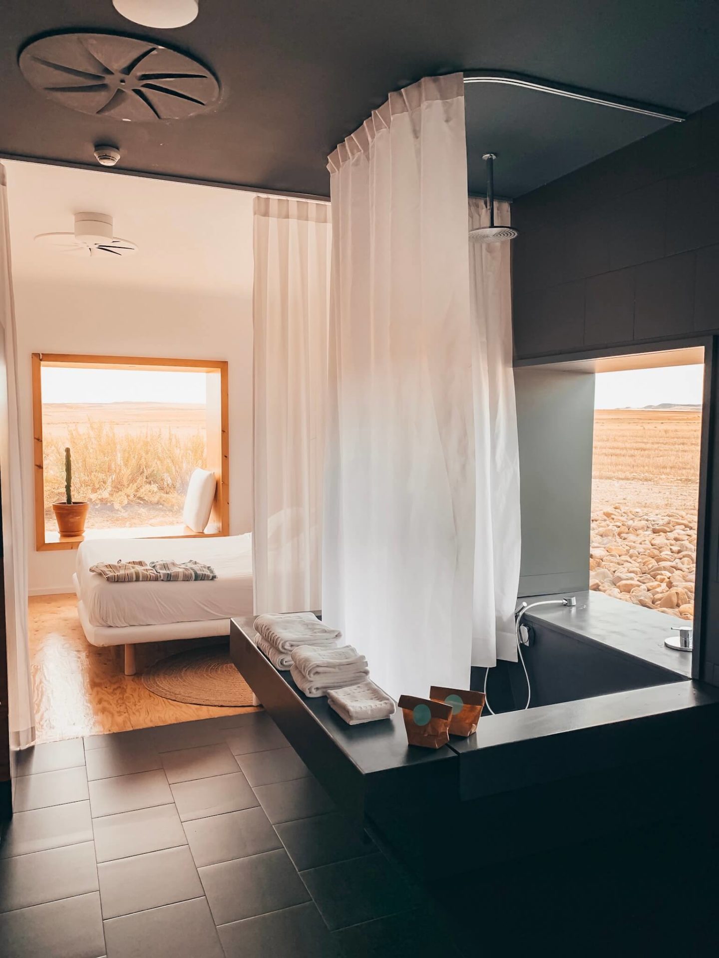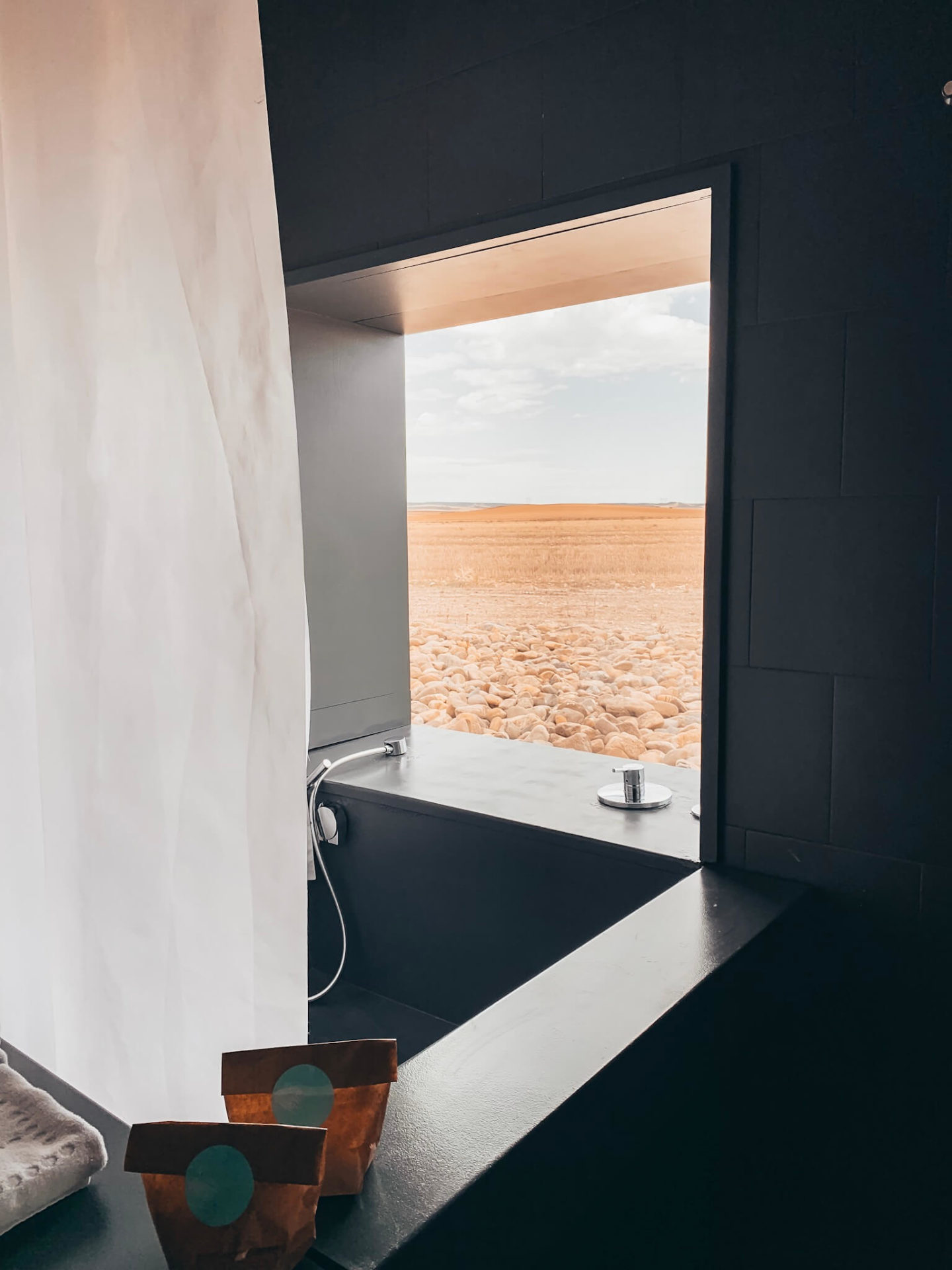 Pour la 2e fois, je pose mes valises dans le désert des Bardenas, au nord de l’Espagne. Un décor saisissant, presque irréel, où l’on a l’impression de voyager de l’autre côté de l’Atlantique, en plein cœur du Far West. Cette fois, je vous emmène découvrir Aire de Bardenas, un hôtel haut de gamme à l’architecture minimaliste, parfaitement intégré à ce paysage brut et fascinant.