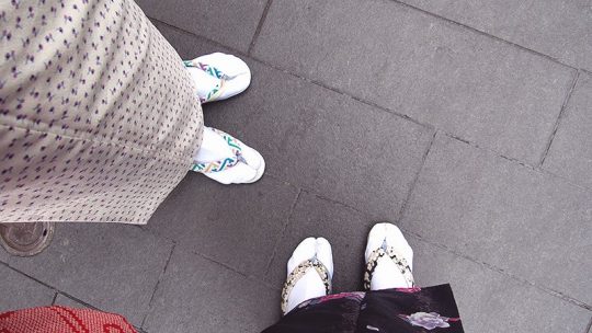 A l’occasion de cette journée, nous nous sommes rendues le matin dans une boutique qui loue des kimonos à la journée. Sur place, vous choisissez votre kimono en fonction de votre budget, vous en trouvez de 3 000 Yens (20€) à quasiment 20 000 yens (150€) puis des femmes nous habillent de manière complètement traditionnelle (on a 2 épaisseurs sous le kimono, plus une serviette placée au niveau de la ceinture et de tout le ventre.. et il faisait juste 25°C…). Après l’habit, on nous emmène nous faire coiffer, les coiffures sont à choisir parmi 5 ou 6 proposées, et enfin on nous donne des chaussettes spéciales (Tabi) pour porter les sandales traditionnelles (Zori). Et voilà, après un moment de détente et préparation, on est prête pour déambuler toute la journée dans les temples, Arashiyama et faire plein de photos !