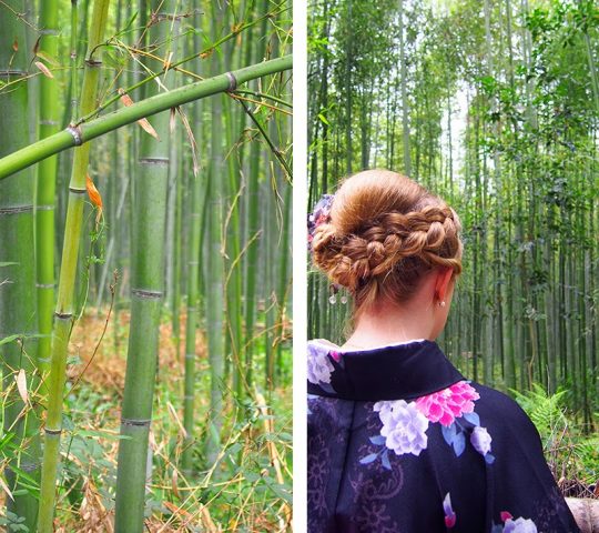 Direction Arashiyama (« montagne de la tempête »), une forêt de bambou, habillée en tenue traditionnelle de la tête au pied : un kimono.