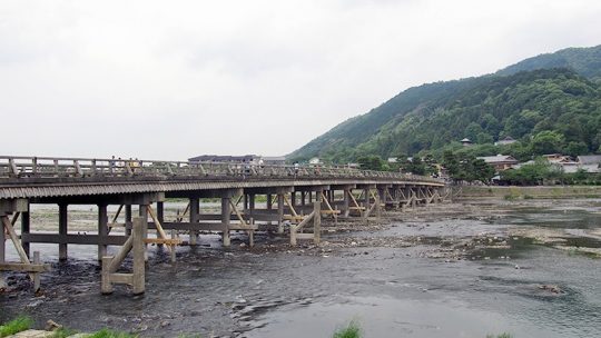 A la sortie de cette foret de Bambou, à 10mn de marche, se trouve un célèbre pont, le Togetsukyo (« le Pont qui Traverse la Lune »), LE symbole d’Arashiyama, construit à l’origine pendant la période Heian (794 – 1185). Il traverse la rivière Hoku et longe les montagnes. Apparemment le cadre est somptueux au printemps lorsque les cerisiers sont en fleurs (Hanami) puis en automne lorsque les arbres sont rouges (les momiji).
