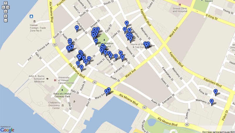 Pour admirer ces bâtiments colorés, direction le quartier Kaka’ako de Honolulu, situé le long de la rive sud de l’île d’Oahu à l’ouest de Waikiki. Un endroit plutôt branché, en plein développement, avec beaucoup d’artistes, de restaurants/salons de thé originaux et une vraie tendance écolo.